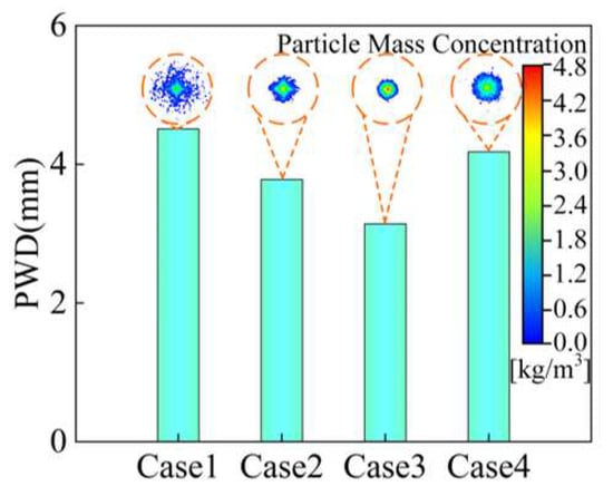 In this paper, the middle point of the convergence plane is the center of the circle and, when the circle completely covers 86.5% of the maximum concentration of powder mass, the diameter of the circle is the powder waist diameter (PWD). Figure 8 shows the waist diameter of the powder stream with different outlet shapes and the powder concentration distribution of the corresponding plane. On the convergence plane, the convergence powder concentration distribution morphology of the contraction type outlet structure presents a “cross shape”, which corresponds to the powder particle movement trajectory in Figure 7, and the powder convergence becomes worse with the increase in duc. Among the different outlet structures, the parallel type of outlet structure obtained the minimum waist diameter of the powder stream, which is 3.14 mm, and compared with Case 1, the powder waist diameter is reduced by 30%. Therefore, the parallel type of outlet is the most favorable geometry for powder convergence among the three kinds of outlet structures.