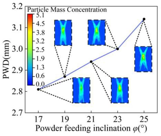 The powder waist diameter formed by different powder feeding inclination angles φ is shown in Figure 9, and the powder stream cross-section concentration distributions of different angles between 17° and 25° are given respectively. With the decrease in the powder feeding inclination angle φ, the distribution of powder particles in the feeding process is more uniform, and the waist diameter of the converging powder stream is smaller. When the feeding inclination angle φ is 17°, the minimum waist diameter of the powder stream is 2.81 mm, which is 10.5% lower than that when the feeding inclination angle φ is 25°.