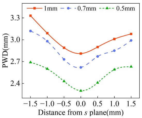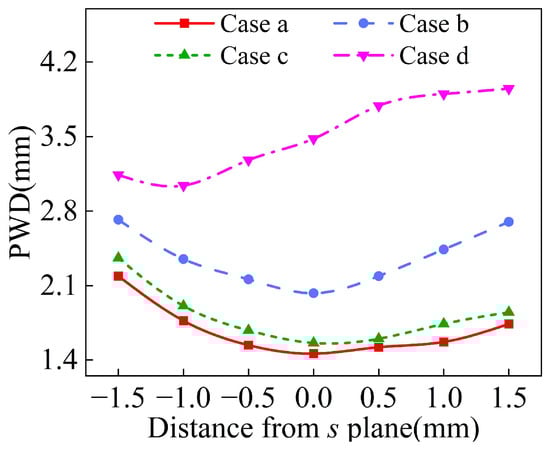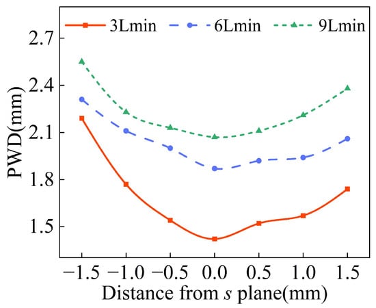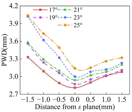 The process of powder convergence can be divided into three regions: the pre-waist region, the waist region, and the dispersion region. In L-DED, the distance between the powder convergence plane and the deposition surface is no more than 1.5 mm, so the waist diameter distribution of different powder feeding inclination angles φ is analyzed at 1.5 mm above and below the convergence plane s. As shown in Figure 10, the s plane in the figure is parallel to the bottom plane of the annular nozzle and 10 mm away from it. It is assumed that the vertical downward direction along the Z axis is the positive direction. With the increase in powder feeding inclination angle φ, the difference in the waist diameter at the same distance above and below the convergence plane becomes larger, indicating a smaller the waist region. Therefore, when the powder feeding inclination φ is 17°, the best powder convergence effect is obtained.