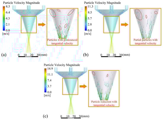 Particle trajectories and velocity vectors of powder with different outlet gaps(the vectors of powder particles with obvious tangential velocity are circled in red circles in the figure): (a) 1 mm, (b) 0.7 mm, and (c) 0.5 mm.