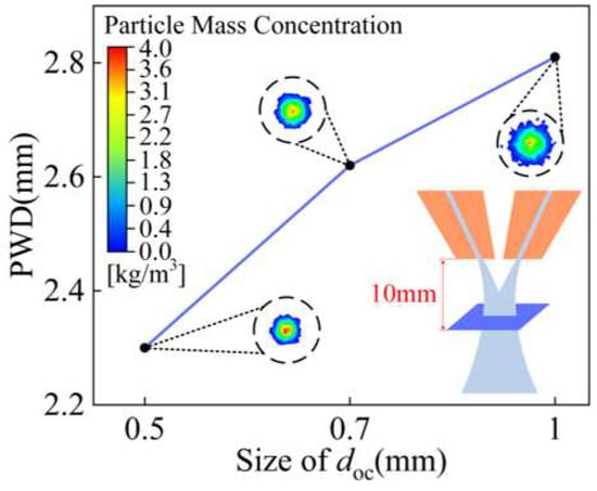 The powder waist diameter of doc with different outlet gaps at the convergence plane is shown in Figure 12. When doc is 0.5 mm, the powder waist diameter is 2.3 mm, which decreases by 18% compared with that when doc is 1 mm. As shown in Figure 13, with the decrease in doc, the difference in waist diameter is not significant at the same distance above and below the convergence plane and the better the powder convergence.