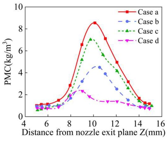 The powder waist diameter and powder mass concentration distributions of the powder bundle with different inlet shapes along the Z axis are shown in Figure 15 and Figure 16. Among the four inlet shapes analyzed, Case a obtained the best powder convergence, and its powder waist diameter at the convergence plane s is 1.42 mm, which is 38% lower than that of the inlet shape before optimization. On the contrary, in Case d, the convergence becomes worse. The “drainage” rectifier structure is designed mainly to weaken the tangential velocity of powder particles. If the length of the rectifier tube is too small or the diameter is too large, the collision frequency of powder particles will be reduced, it is difficult to dissipate the tangential velocity of powder particles, and ultimately the powder convergence is worse. Therefore, the inlet shape with a powder storage chamber structure is the best geometrical characteristic structure among the four analyzed, which is conducive to improving the powder utilization rate of the annular nozzle.