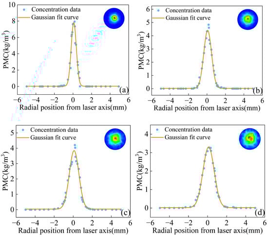 The function fitting of the powder mass concentration and cloud diagram of concentration distribution: (a) 15–53 μm, (b) 53–90 μm, (c) 90–120 μm, and (d) 120–150 μm.