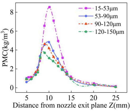 After powder aggregation, its mass concentration can be approximated as a Gaussian distribution in the radial direction. Figure 17 shows the Gauss fitting concentration distribution curve of different powder particle sizes at the convergence plane, and the powder concentration distribution at the corresponding convergence plane is shown in the upper right corner. With the increase in powder particle size, the maximum powder mass concentration of the convergence plane gradually decreased, and the waist diameter gradually increased. When the powder particle size is 120–150 μm, the waist diameter is 2.58 mm, which increased by 81.7% compared with the waist diameter of particles of 15–53 μm. In addition, as the particle size of the powder increases, the interaction force between the powder particles increases, resulting in the deterioration of the fluidity of the powder and the shift of the distribution position of the maximum mass concentration of the powder stream. As shown in Figure 18, with the increase in the particle size of the powder, the position of the maximum mass concentration of the powder flow along the Z axis shifts upward. Therefore, a small particle size is more suitable for annular nozzles, which is conducive to improving the powder utilization rate in the L-DED process and improving the forming efficiency and forming quality of the additive manufacturing parts.