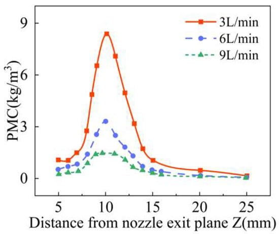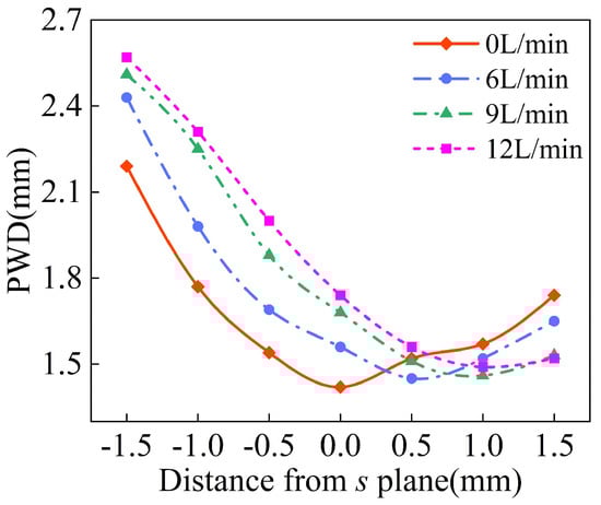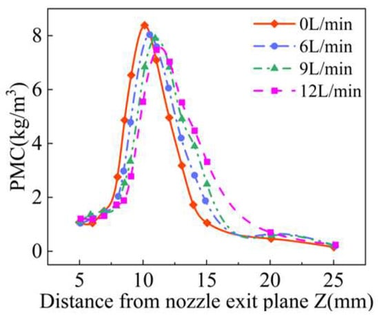As shown in Figure 19, the changes of the longitudinal convergence of powder produced by four groups of laser protective gas with different flow rates were analyzed, and the carrier gas flow rate of each group was set to 3 L/min. With the gradual increase in the laser shielding gas flow, the powder mass concentration along the Z axis of the powder stream decreases. Moreover, the addition of the laser shielding gas also increases the speed of the powder particles along the Z axis, so that the position where the highest concentration of the powder flow is also moving down and, when the flow rate of laser shielding gas is 12 L/min, the highest concentration position along the Z axis decreased by about 1 mm. As shown in Figure 20, showing the waist diameter of the powder stream at different positions of the Z axis, corresponding to Figure 19, the waist diameter of the minimum powder stream gradually decreases, but when the flow rate of the laser shielding gas is the highest, the waist diameter of the powder stream is only increased by 3%, indicating that the laser protection gas has little influence on the waist diameter of the powder stream.