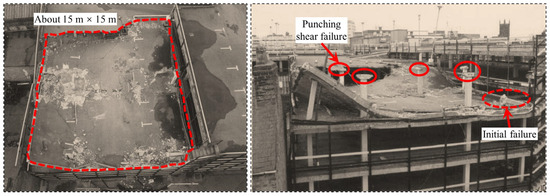 Historically, two cases of progressive collapse in flat slab systems have been documented: (1) The 1971 collapse of a 16-story cast-in-place flat-plate apartment building on Federal Avenue, USA [2], as illustrated in Figure 1. The initial failure originated at the flat slab–column joint on the east side of the 16th floor, triggered by premature removal of roof shoring (resulting in mechanical room overload), compounded by substandard concrete (with compressive strength reaching only 60% of specified values), which exacerbated through-thickness cracking at the slab soffit. Forensic investigations identified three primary causes: inadequate rebar development length (30% below code requirements), improper concrete curing, and erroneous construction sequencing. (2) The 1997 collapse of the Pipers Row flat-plate parking structure in the UK [3], illustrated in Figure 2. The initiating event involved a punching shear failure at a corner column supporting a 15 m × 15 m roof slab. The original design, according to BS 8110 [4], underestimated edge joint shear loads by 20%, coupled with a concrete carbonation depth of 30 mm, which caused over 40% corrosion in top reinforcement and severe anchorage degradation. Post-collapse analysis revealed two critical factors: localized repairs that failed to address systemic deterioration, and the absence of periodic inspection protocols, which accelerated structural degradation. Additionally, notable cases include the 1973 collapse of the Skyline Plaza flat-plate apartment building in the United States [5] (due to shore failure during construction), the 1983 collapse of the Kimberley-Clark flat-plate warehouse in Canada [6] (due to insufficient consideration of extreme snow load scenarios in design), the 1987 collapse of the Morbio flat-plate shopping complex in Switzerland [7] (caused by a 35% reduction in joint shear capacity due to concrete spalling from freeze–thaw cycles), and the 2021 collapse of the Surfside flat-plate condominium in the United States [8] (due to a 50% cross-sectional loss in reinforcement of ground-floor columns caused by long-term seawater erosion). These incidents collectively highlight inherent limitations in conventional design codes regarding the prediction of extreme loads, material durability assessment, and joint redundancy design [9,10]. These limitations have prompted the structural engineering community to shift focus from component-level analysis to holistic structural resilience evaluation, advancing the theoretical framework for progressive collapse prevention.
