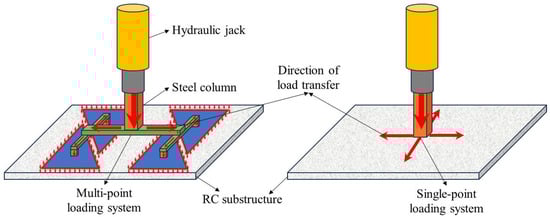 Quasi-static testing protocols involve three sequential phases: (1) the pre-removal of designated column(s) to simulate initial local failure, (2) the anchorage of failed column stubs using reaction frames to simulate the actual boundary conditions of residual structures, and (3) the application of load-controlled or displacement-controlled loading protocols. As shown in Figure 3, two loading configurations exist: single-point loading (concentrated force application) and multi-point loading (simulating uniformly distributed loads). The single-point configuration directly applies concentrated loads at the removed column location, providing simpler implementation and operational convenience. Conversely, the multi-point configuration utilizes spreader beams and distribution plates to distribute concentrated loads across multiple application points. Qian et al. [17] conducted a comparative analysis of the progressive collapse resistance of flat-plate systems under two loading configurations. The experimental results revealed the secondary punching shear failure at the removed column location under single-point loading, while multi-point loading eliminated such localized failure modes, better simulating actual collapse mechanisms. This observation aligns with the US Department of Defense Unified Facilities Criteria [15], which recommends distributed load simulation for collapse testing. This methodology was further validated by Sasani et al. [18] and Sasani and Sagiroglu [19,20] through existing building tests, demonstrating rapid axial force dissipation above removed columns, while gravity-induced distributed loads dominate the structural downward movement. However, during the large deformation phases, non-uniform load distribution occurs due to geometric nonlinearity in slab deformation.