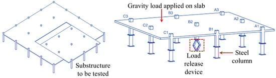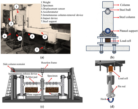 While the quasi-static testing methodology effectively captures the evolution of resistance mechanisms during collapse progression, forensic analyses of actual collapse incidents [21,22,23] reveal that initial structural damage predominantly occurs within milliseconds of abnormal dynamic actions. Static testing inherently fails to replicate the critical dynamic responses during the instantaneous column loss. Consequently, dynamic testing holds significant engineering importance. In a dynamic test, the distributed load under normal service conditions is first simulated by stacking or suspending heavy objects. Then, by removing a column instantaneously, the structural dynamic response and the dynamic process of load redistribution can be analyzed. To achieve instantaneous column removal, two equivalent methods are commonly adopted: (1) placing a vertical support beneath the failed column [24], with an instantaneous column-removal device (ICRD) that causes the support to lose its load-bearing capacity instantaneously, as shown in Figure 4a,b; and (2) installing a hook connection above the failed column [25], with the sudden release of the hook simulating instantaneous column failure, as illustrated in Figure 4c,d.