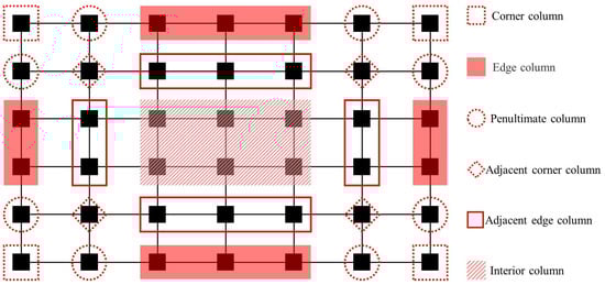 In practical engineering scenarios, perimeter columns exhibit significantly higher vulnerability to impact-induced failure mechanisms caused by aircraft collisions, vehicular impacts, or rockfall events. Furthermore, abnormal extreme loads, including seismic actions, fire exposure, and blast loading, can induce simultaneous multi-column failure patterns through cascading failure mechanisms. Therefore, different accidental extreme loads can lead to various column failure scenarios, which, in turn, affect the structural resistance to progressive collapse. Figure 5 codifies the locations for progressive collapse analysis using standardized nomenclature.