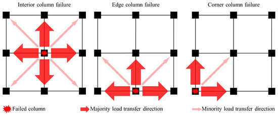 A comparative analysis of failure modes reveals distinct load transfer mechanisms. Ma et al. [39] demonstrated similar force redistribution patterns between the edge column failure and combined edge-interior column failure scenarios, where adjacent edge columns and corner columns collectively sustain 83–91% of redistributed loads, while distant corner columns contribute less than 5%. Notably, load transfer mechanisms evolve dynamically through collapse progression. Qian et al. [17] quantified, through interior column removal tests, that compressive membrane action (CMA) dominates the initial stages, redistributing 74% of loads bidirectionally to adjacent columns. Post-punching failure, tensile membrane action (TMA) activates through rebar-anchorage mechanisms, with load distribution shifting to 19% (adjacent edge columns) and 6.4% (corner columns). These findings confirm that interior column failure scenarios benefit from superior redundancy, exhibiting higher collapse resistance than the perimeter column failures. Typical load redistribution pathways are schematically illustrated in Figure 6, highlighting critical differences in force transmission topology between failure modes.