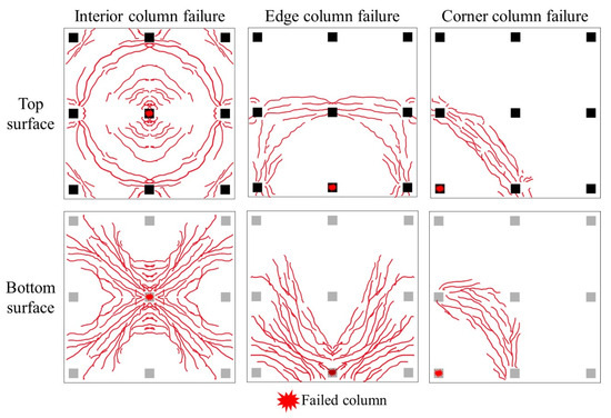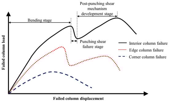 Based on experimental studies by various scholars [17,34,35,36,37,38,39], the load–displacement curve (Figure 7) and failure mode diagram (Figure 8) for the same flat slab–column structure under different column failure scenarios are summarized. The load–displacement curve can generally be divided into three stages: the bending stage, the punching shear failure stage, and the post-punching shear mechanism development stage. In the bending stage, the structure mainly relies on the bending mechanism of the slab and the CMA to resist collapse. When the punching shear stress near the joint reaches the concrete’s ultimate limit, the structure experiences punching shear failure, resulting in a sudden drop in resistance. If the structure includes complete through-column reinforcement or shear-resistant reinforcement, post-punching shear failure allows the development of the TMA to resist collapse, thereby increasing the resistance again. In the case of interior column failure, the surrounding frame can still provide strong boundary constraints, leading to a higher first peak load. After the punching shear failure, the structure can still develop the TMA, leading to a higher ultimate load. In contrast, when an edge column fails, the boundary constraints are relatively reduced, causing a decrease in both the first peak load and the ultimate load. Moreover, the structure’s ductility is weaker than in the interior column failure scenario. When a corner column fails, due to the lack of necessary boundary constraints, the structure cannot develop effective CMA and TMA. Consequently, the structure fails after reaching the first peak load, and the resistance consists of only one stage. In terms of failure modes, when an interior column fails, a ring-shaped crack forms on the upper surface of the slab. When an edge column fails, the crack forms a semi-ring around the failed edge column. When a corner column fails, most of the cracks are concentrated in the slab area around the corner column.