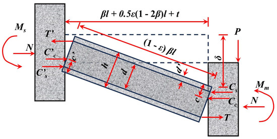 where P is the structural bearing capacity induced by the membrane compression mechanism; b is the width of the beam; ln is the span length of the beam; β1 is the ratio of the distance between the mid-span plastic hinge and the nearest support to 2lₙ; δ is the vertical displacement of the inner column; h is the depth of the beam; T′ and T are the tensile forces in the steel at the support and beam–column interface, respectively; C′ and C are the compressive forces in the concrete at the support and beam–column interface, respectively; ε is the strain caused by horizontal shrinkage and creep; t is the horizontal movement at the support; and the calculation formula for ε is shown in Equation (6).