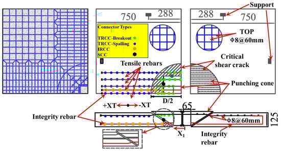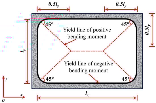 Mirzaei [7] and Ruiz et al. [11] further considered the synergistic effect between bending and integrity reinforcement, and proposed Equations (22)–(27). The model assumes that the upper concrete of the reinforcement experiences continuous failure (Figure 16) and establishes the plastic hinge development equation (Equation (25)) and the strain–rotation relationship (Equations (26) and (27)). While this approach offers a more comprehensive view of the interaction between bending and integrity reinforcement, it relies on idealized failure assumptions, particularly the assumption of continuous failure in the upper concrete, which may not fully reflect actual conditions. Ruiz et al. [11] systematically quantified the coupled effects of bending reinforcement, integrity reinforcement, and concrete parameters using Equations (29)–(38), with Equations (30)–(35) focusing on the relationship between tensile reinforcement contribution and geometric parameters. While these equations provide valuable insights into the interaction of different factors, they may oversimplify complex behaviors that require further experimental validation. Habibi et al. [75] proposed Equation (28), which uses a dual inclination angle hypothesis of 45° and 14°, but only considers the reinforcement membrane mechanism, resulting in an insufficient evaluation of concrete failure severity. This limitation reduces the model’s accuracy in capturing the full extent of punching shear failure, highlighting the need for further refinement.