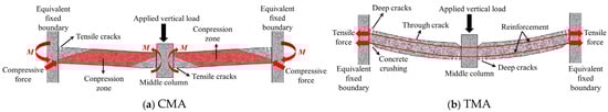 During the progressive collapse of flat slab–column structures, four primary resistance mechanisms are involved in resisting failure: the CMA, the TMA, the punching shear mechanism, and the post-punching shear mechanism [40]. Several experimental studies have revealed the operating principles of the resistance mechanisms.
