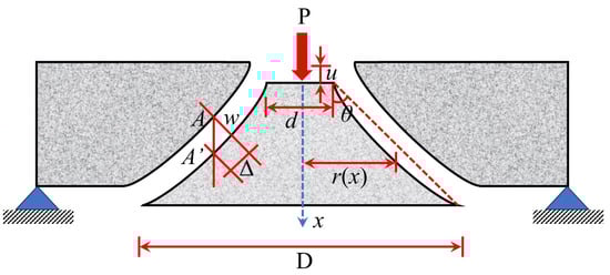 The plastic limit theory proposed by Braestrup [61] utilizes the linear Mohr–Coulomb criterion [62] and assumes the punching shear region to be a slanted cone (Figure 12). Although this theory can explain the punching failure mechanism of circular plates, the calculation results exhibit considerable scatter. Jiang et al. [63] improved this theory by adopting a quadratic parabolic yield criterion, significantly enhancing its general applicability. Bortolotti [64] also optimized this theory and found that plastic strain leads to concrete softening, resulting in changes to the local internal friction angle. Based on experimental data, Muttoni [65] proposed the Critical Shear Crack Theory (CSCT), which determines the ultimate load by identifying the intersection point of the crack width and the load–rotation curve (Figure 13). This theory comprehensively considers parameters such as plate thickness, reinforcement ratio, and aggregate size. Its shear stress distribution in the triangular form, along with the assumption of critical crack propagation, reveals the sudden nature of brittle failure. However, while this theory provides a more comprehensive approach, it still assumes idealized behavior that may not fully reflect real-world conditions. The calculation method is shown in Equation (14).
