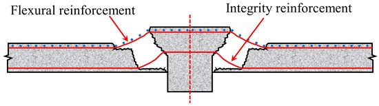 After the punching shear failure in flat slab–column joints, the bending reinforcement and integrity reinforcement become the key force transfer paths linking the punching cone to the floor slab (Figure 14). These reinforcements are gradually activated under sustained loading, forming the “last line of defense against progressive collapse” and delaying the overall failure process through the membrane action mechanism [71].