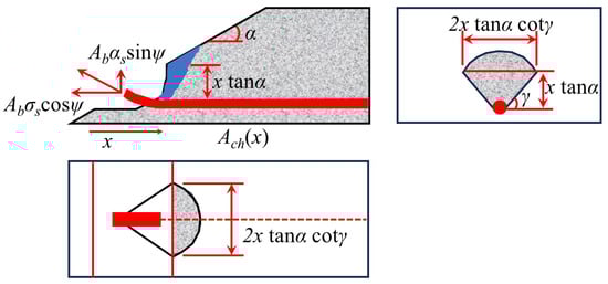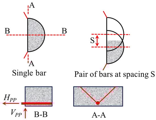 where α is the inclination of the punching cone relative to the horizontal direction; γ is the angle of the punching cone; and fct.eff is the effective tensile strength of concrete, and fct.eff is given by nDfct, where nD is a reduction factor that accounts for the variation of tensile stress from the edge of the reinforcement to the surface of the slab. If there are n reinforcement bars, the total area of the affected region is given by Equations (23) and (24).