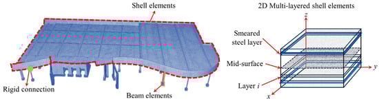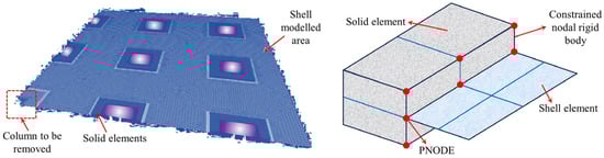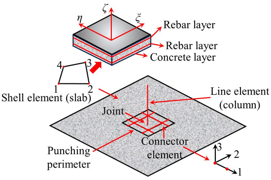 To reduce computational effort, Liu et al. [76,77] referred to simplified modeling methods such as the grid model [78,79,80], equivalent frame, and equivalent beam method [81,82,83,84,85,86,87,88] and proposed a “macro-scale finite element model” (Figure 17) that includes connection elements and shell elements to simulate the nonlinear response and node punching shear failure of flat slab–column structures under complex loading conditions. The model uses shell elements to simulate the bending performance and load redistribution characteristics of the slab and connection elements to simulate the separation that occurs at the flat slab–column joint during punching shear failure. Additionally, the model defines a deformation-based punching shear failure criterion for the connection elements to simulate the punching shear failure and load transfer at the flat slab–column joint. The simulation results indicate that using the shell elements can accurately predict the load–displacement response of the structure. However, due to the assumption of constant concrete shear stiffness, the exclusive use of shell elements tends to lead to an overestimation of the torsional resistance of the flat slab–column joint, resulting in an overestimation of the joint’s ability to transfer unbalanced bending moments.