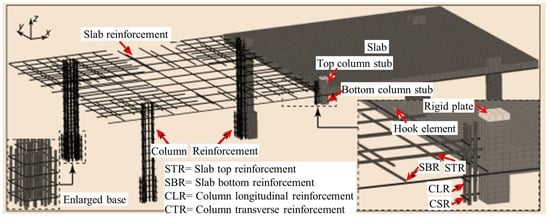 Progressive collapse in structures refers to the phenomenon in which initial damage caused by accidental extreme loads propagates through structural components, triggering chain reactions that ultimately lead to either complete structural failure or a disproportionate large-scale collapse that exceeds the extent of the initial damage [1]. As a beamless floor system, reinforced concrete flat slab–column structures facilitate direct force transfer between columns and flat slabs, providing significant advantages in spatial efficiency and construction convenience. These characteristics have enabled their widespread use in commercial complexes, parking structures, and similar building types. However, their simplified load transfer pathways and low redundancy make the joint regions particularly vulnerable to punching shear failure. This inherent vulnerability significantly increases the potential risk of progressive collapse in such structural systems.