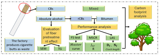 The test design is illustrated in Figure 1. Experimental plan of the study. The performance of CB fiber bitumen is comprehensively assessed across three temperature ranges: high, medium, and low. Additionally, its ecological benefits are evaluated through a carbon footprint analysis.