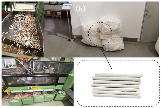 Meanwhile, another source of concern is that during the manufacturing of cigarette filter rods in factories, the filter rod may be too long or short, the diameter may be incorrect, or the glycerol content may be unsuitable, resulting in diacetate filter rods that do not meet the use standard, resulting in a large amount of filter rod waste [27]. This category of discarded cigarette butts represents unused acetate, which is more environmentally friendly than carcinogen-containing discarded cigarette butts. According to a survey, in producing a ton of diacetate filter rods, approximately 0.5–1.0% of a production machine in regular operation’s products will be substandard. Unfortunately, this part of the waste fiber is rarely utilized.