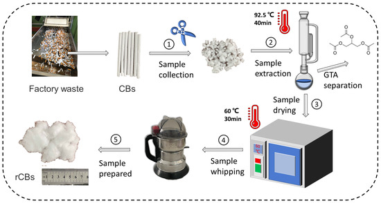 In order to increase the bonding between fibers to improve the robustness and adsorption ability of the molded filter rods, atomized glyceryl triacetate (GTA) is usually sprayed into the fibers at a specific ratio during the production process. According to gel theory, plasticizers disrupt polymer–polymer interactions via hydrogen bonding and van der Waals forces [30]. The migration of GTA increases the interactions between fibers and within molecules, making it challenging for them to flocculate and easy for them to agglomerate in the binder. Therefore, by removing the GTA, the fibers are more easily dispersed uniformly between the binders, thus enhancing performance. This paper used cigarette filters as the raw material and extracted them with a Soxhlet extractor using anhydrous ethanol as an extractant [31]. The fiber treatment process is shown in Figure 3.