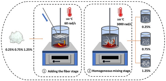 - According to the distribution mixing method, the preparation of the acetate fiber–bitumen mixture with an acetate fiber dosing of 0.25%, 0.75%, and 1.25% was completed. This process is shown in Figure 4.