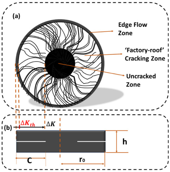 - Edge flow zone: The stage where the stress intensity is less than the extended critical stress intensity . Cracks sprout early in fatigue and occur in the edge region. Edge flow arises from the instability of complex edge regions [39].