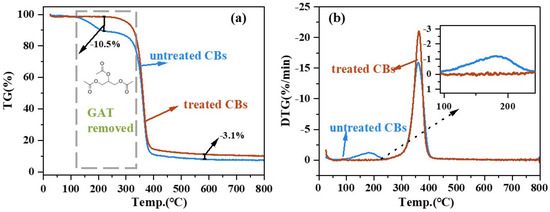 In Figure 6a, the changing mass of the untreated cellulose acetate (CBs) is compared with that of treated cellulose acetate (r-CBs) in the temperature interval of 128–222 °C. The heat loss rate of the CBs was 10.50%, where the lost mass was precisely equal to the mass of GTA 10% [28] in the discarded cigarette butt. Chen et al. [40] discovered that GTA was primarily removed when the temperature reached 300 °C in activated carbon adsorption of GTA, further proof that it was GTA that was released in the temperature range of 128–222 °C. In Figure 6b, no thermal decomposition of rCBs occurred between 100 °C and 200 °C, indicating that the alcohol treatment method can improve the thermal stability of cigarette filter fibers to meet the requirement of 160 °C to 200 °C in bitumen modification processing.