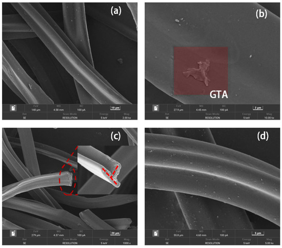 A Y-shaped cross-section of untreated CB fibers with smooth surfaces is shown in Figure 7a,b. The residual plasticizer GTA on the surface of CBs caused the fibers to be interwoven, making them challenging to disperse, to the detriment of the fibers, and causing them to be easily agglomerated in the binder [41]. In Figure 7c,d, the fiber surface still shows a Y-shape, with no blocky GTA on the surface, indicating that the alcohol treatment can effectively remove the plasticizer GTA. Moreover, the surface of rCBs was rougher, which increased the specific surface area of the fibers in contact with the bitumen to facilitate the embedding of fibers.