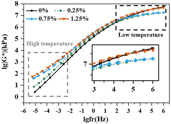 The complex shear modulus master curves at 30 °C for different CB doping levels in Figure 8 show that different CB doping levels had different effects on the binder, especially in the high-frequency (low temperature) and low-frequency (high temperature) stages, where the differences were significant. In the low-frequency phase, CB bitumen had a higher dynamic modulus than the matrix; this difference increased with the amount of admixture and reached a maximum at 1.25%. The results indicate a higher ability to resist deformation at high temperatures. From a “polymer long chain” perspective, the random distribution of fibers absorbed most of the concentrated stress and kept the bitumen flexible [42], ensuring the high-temperature stability of the adhesive.