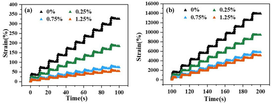 MSCR time–strain curves of binders with different CB contents at 58 °C: (a) 0.1 kPa; (b) 3.2 kPa.