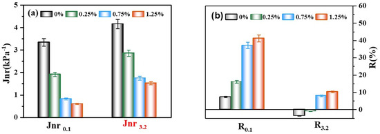 Figure 10a shows that the matrix bitumen had substantially higher irrecoverable flexibility, Jnr, than the CB bitumen at either 0.1 or 3.2 kPa stress response. As the fibers increased, the amount of Jnr was more significant; this trend may be explained by the fact that CB fibers absorbed lighter components from the binder [46], which, from the viewpoint of the colloidal hypothesis, was seen as “increasing the viscosity”. As shown in Figure 10b, the strain recovery rate of CB bitumen was significantly greater than that of the bitumen matrix, and the high-temperature performance of the mixtures with 0.75% and 1.25% CBs was significantly better than that of the bitumen matrix. However, with 1.25% fiber content, Jnr and R appeared to decrease, and high-temperature performance improved by only a little. The binder lost its elastic capacity when the bitumen matrix and 0.25% CBs had negative R3.2 values during excessive loading. R3.2 rose with admixture content, regaining viscoelastic properties. The CB fibers improved the binder’s high-energy deformation resistance, especially under heavy loads.
