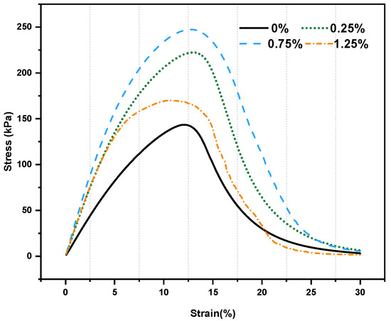Based on the LAS test, the strain–stress variation curves for different adhesives are shown in Figure 11. Initially, the stress varied with strain, while after the peak strain, the stress decreased with increased strain. Due to different doping levels, the CB–binder mixtures had higher peak stress and wider strain intervals than the binder matrix. Owing to this, the fibers in the binder increased the toughness, allowing it to overcome higher stress. However, it is interesting to note that the peak strain of the binder decreased when the doping level exceeded 1.25%, being even lower than that at 0.25%, indicating that more fibers made the binder stiffer and shortened its fatigue life.