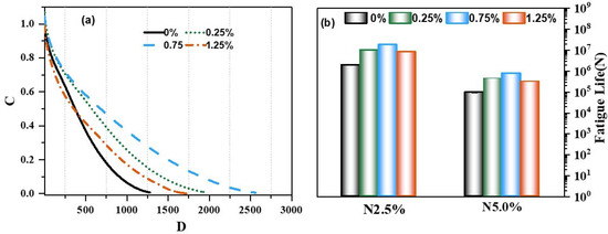 In Figure 12b, the number of damage cycles Nf for various binders subjected to strains of 2.5% and 5.0% amplitude is shown. Strain reduced the service life of all four binders, indicating that high deformation, such as bulging and wave damage, shortens the lifespan of bitumen. The life of the binder was extended with the addition of CBs, as evidenced by the fact that the number of cycles of the CB fiber–binder mixtures at a 2.5% or 5.0% strain level was greater than that of the binder matrix. However, the issue remained the same, and as expected, the overall load-bearing capacity of the binder decreased at dosing levels above 1.25%.