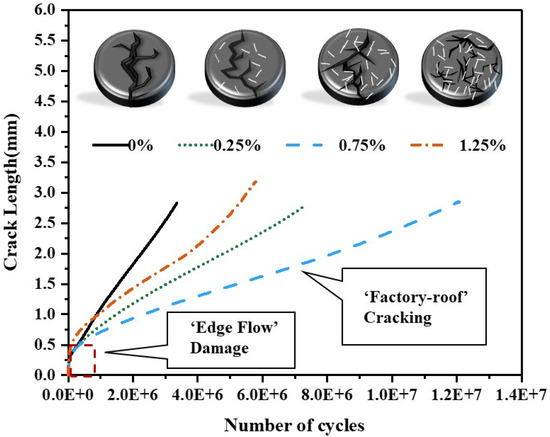 The CB–binder mixture was found to have the ability to retard the rate of crack expansion in the specimen in the “factory-roof” area, with the base bitumen and 0.25% and 0.75% CB mixtures having comparable crack lengths by the end of the crack expansion but having a higher number of cycles compared to the base binder. For the same crack length, the higher the CB content, the more cyclic shear it could withstand, and, consequently, the greater the positive response to fatigue resistance. However, after reaching 1.25% fiber content, all aspects of the binder performance declined. The reason for this was that while the addition of fibers reduced the consistency of the bitumen and caused it to harden, appropriate fibers still made the binder behave like an elastic solid and resist fatigue cracking under repetitive traffic better than the base bitumen [47]. In contrast, excessive fibers caused the binder to harden excessively and crack more readily.