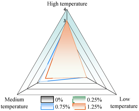 In the high-frequency stage, the dynamic moduli of 1.25% CB bitumen and basic bitumen were almost consistent, while 0.25% and 0.75% CB bitumen had a lower dynamic modulus, respectively, with better low-temperature crack resistance. This shows that though the 1.25% CB–binder mixture was more effective at the high-temperature stage, its performance decreased with the increase in fiber doping, resulting in a hardened binder consistency [43], and the deeper hardening at low temperatures led to cracking [44]. The 0.75% CB–binder mixture was significantly better in its overall performance.