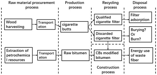 (3) Recycled waste cigarette butts will positively impact binder modification and reduce carbon emissions during binder production, construction, and use by two-thirds compared to conventional roads. Replacing other fibers with waste materials will minimize resource waste and create an ecological–economic win–win situation.
