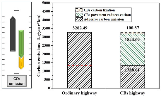 The annual carbon emissions per km of bitumen for the various roads were calculated from Table 2 and are shown in Figure 17. When compared to regular bitumen roads, CB–bitumen roads have significant emission reduction benefits, with the amount of carbon released from the roads reduced by two-thirds of the original amount. Using fibers as solid carbon sources, 100.37453 kg of CB fibers were permanently sequestered in the pavement. It was especially noteworthy that the carbon emission reduction achieved by improving the fatigue life of the pavement accounted for more than half of the carbon emissions of a typical road, indicating a significant effect.