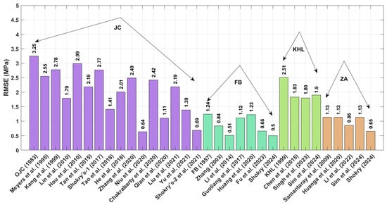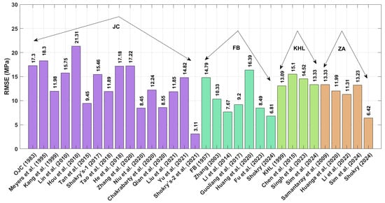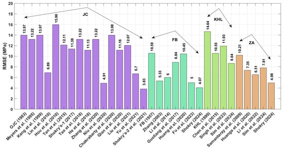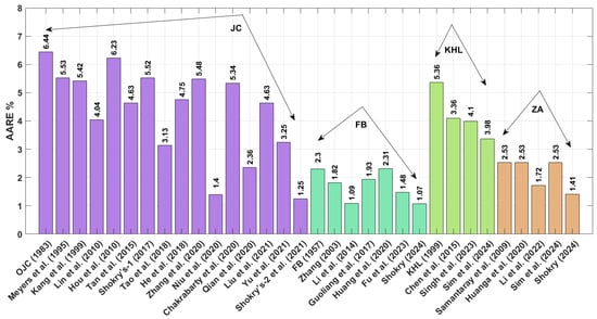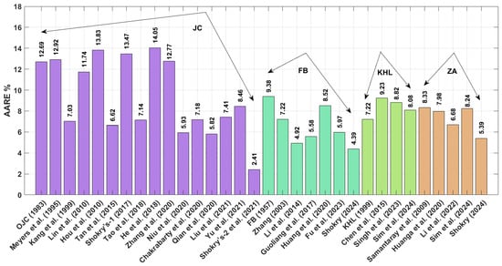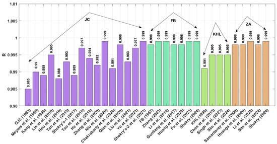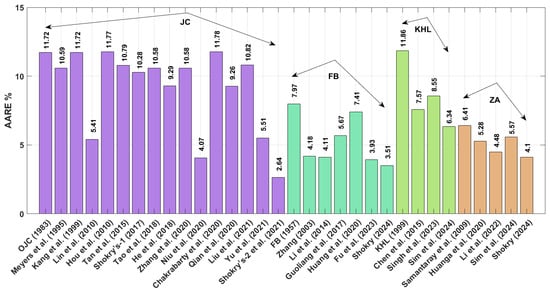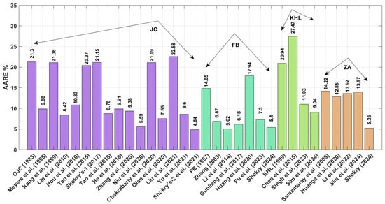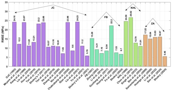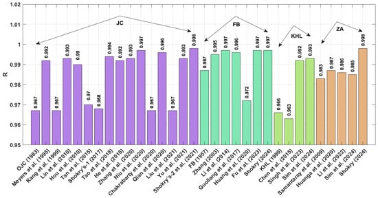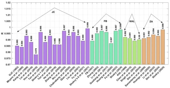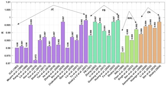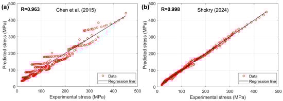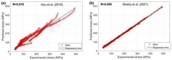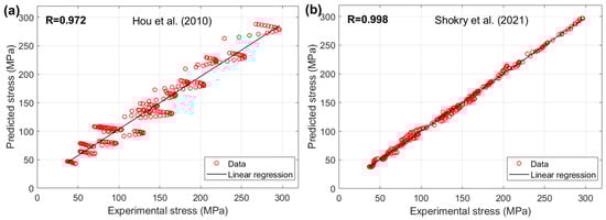 The findings indicate that the modified model based on the JC model, as developed by Shokry et al. [48], demonstrates superior predictive accuracy with an average R value of 0.9985 ± 0.0005, an average AARE of 2.79 ± 1.34%, and an average RMSE of 3.36 ± 1.85 MPa. These values indicate both high accuracy and low variability across the four different alloy systems. Additionally, four other modifications—derived from the FB and ZA models revised by Shokry [58], the JC improved by Niu et al. [41], and the FB models refined by both Li et al. [55] and Fu et al. [57]—also effectively enhance the predictive accuracy for flow behavior. These models achieve an average R value of 0.998 ± 0.0006, an average AARE of 4.28 ± 1.84%, and an average RMSE of 5.53 ± 2.53 MPa across the four different alloy systems. These results underscore the potential of these modifications to improve the modeling of hot deformation processes and provide more precise predictions for various alloys.