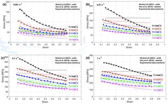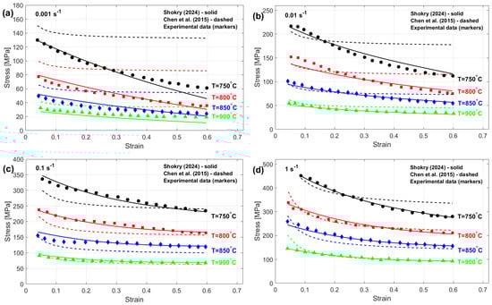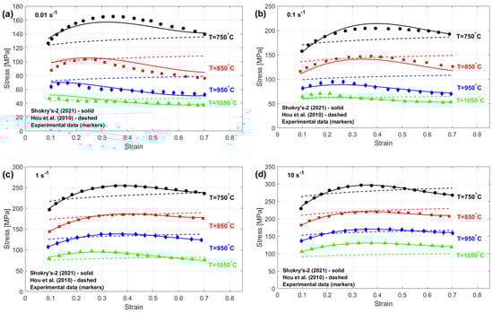 The inaccurate predictions of hot deformation behavior observed with some of the studied models may be attributed to the following several factors: (1) the models require a large number of material constants that need to be carefully determined, and these constants are not universal, varying significantly with the material; (2) they are typically valid only within a limited temperature range and may not accurately predict deformation behavior outside this range; (3) these models mainly focus on macroscopic behavior, often simplifying microstructural changes during deformation, and fail to account for the complex evolution of grain structure, phase transformations, or other microstructural features that can significantly influence the material’s response; (4) they do not inherently consider frictional effects at the tool–material interface, which can significantly affect material flow during deformation, particularly in extreme strain–rate and high-temperature environments; and (5) in real-world industrial settings, deformation often occurs under complex conditions, such as in multi-pass forging, where temperature gradients, varying strain rates, and complex stress states are present.