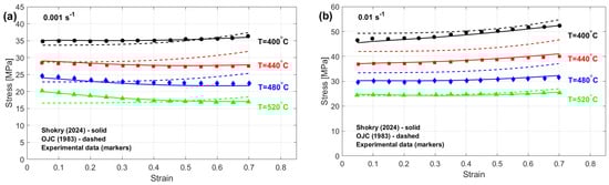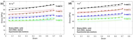 Among empirical constitutive frameworks, the Fields–Backofen (FB) formulation serves as a benchmark for characterizing elevated-temperature plastic response during thermomechanical processing [49]. Despite its effectiveness, the FB model has a notable limitation: it does not explicitly account for thermal softening, a key factor influencing material flow at elevated temperatures. This omission means that while the model provides accurate predictions for certain alloys and material systems [50,51], its reliability diminishes for others, particularly those significantly affected by thermal softening [52,53]. To overcome this limitation, multiple studies have developed refined versions of the FB approach. These adaptations incorporate thermal softening mechanisms into the constitutive framework, enhancing prediction reliability for diverse alloy systems and manufacturing scenarios [54,55,56,57,58].
