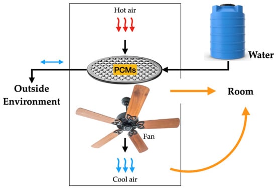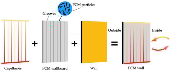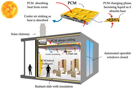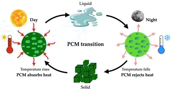 The versatility of PCMs’ usage is another important aspect to consider. They can be incorporated into various structural elements of a residence, such as walls, ceilings, and floors, among others [4,5]. Depending on ambient temperature variations, they can regulate indoor thermal comfort by absorbing or releasing heat. Also, the design and implementation of PCM-based solutions should always consider PCM transition considering the different ambient conditions occurring during the day and night and act accordingly to obtain the most moderate indoor ambience, as is illustrated in Figure 1.