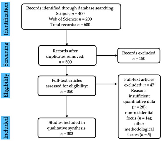 The study selection process followed the PRISMA framework, as illustrated in Figure 2. The initial search across Scopus and Web of Science yielded 600 records (400 from Scopus and 200 from Web of Science). After removing duplicates (n = 100), 500 unique records were screened based on titles and abstracts. Of these, 150 were excluded for not meeting the inclusion criteria (e.g., irrelevant applications, lack of focus on residential buildings, or non-peer-reviewed status). The remaining 350 full-text articles were assessed for eligibility, with 47 excluded due to insufficient quantitative data (n = 28), non-residential focus (n = 14), or other methodological issues (n = 5). Ultimately, 303 studies were included in the qualitative synthesis, covering PCM types, properties, integration methods, and performance outcomes.