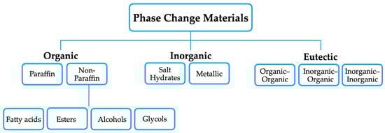 PCMs can be classified into three main categories: organic (such as paraffin and non-paraffin), inorganic (such as metallic salts and salt hydrates), and eutectic mixtures (organic–organic, inorganic–inorganic, and inorganic–organic). An ideal PCM should exhibit a high latent heat of fusion, anti-corrosive properties, enhanced thermal stability, a melting temperature between 20 °C and 100 °C, and cost effectiveness. These properties are essential to ensure that the material can absorb and release large amounts of energy during phase transition, while maintaining its thermal stability [6,38]. Figure 3 summarizes the main types of PCMs.