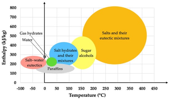 Eutectic PCMs, formed by combining two or more compounds, can have their thermophysical properties enhanced. This is because a eutectic mixture can be designed to optimize the melting point and improve the thermal conductivity and stability. By combining materials with complementary characteristics, it is possible to obtain a PCM with improved heat transfer performance and thermal stability, even after multiple fusion and solidification cycles [42]. These materials offer advantages over pure PCMs, as the phase transition occurs at a more stable temperature with less variation, resulting in a more efficient and long-lasting performance. However, the main drawback of these compounds is their cost, which can be two to three times higher compared to organic or inorganic PCMs [38]. Figure 4 shows the working temperature against enthalpy of the main existing PCMs.