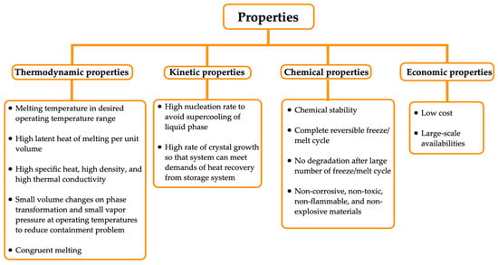 In addition to the classification of PCMs being related to the material properties and their changes with temperature, other parameters such as thermodynamic, kinetic, and chemical properties, as well as economic aspects, are also considered. A list of these parameters is presented in Figure 5 below.