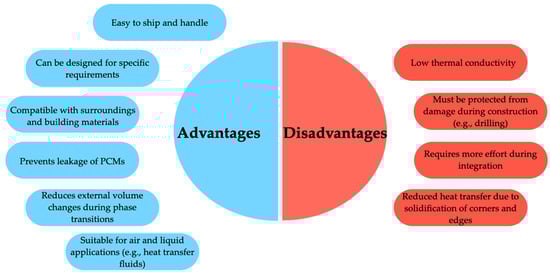 PCMs can be encapsulated in two primary ways: microencapsulation, which involves enclosing the material in containers such as shells, tubes, channels, or thin plates; and microencapsulation, where tiny PCM particles are coated with a specialized polymeric layer [57]. For both techniques, the encapsulating material must meet essential criteria: it should effectively prevent leakage, retain the PCM’s thermal performance, remain chemically stable and non-reactive, be compatible with the PCM and its intended application, and offer structural integrity and safety during handling [58]. Additionally, it should accommodate the PCM’s volume changes during phase shifts, protect against environmental degradation, and possess high thermal conductivity and mechanical strength to maintain performance over time [59]. Materials like aluminum, copper, and stainless steel are frequently used for microencapsulation due to their excellent thermal conductivity, compatibility, and contribution to structural robustness of building components [60].