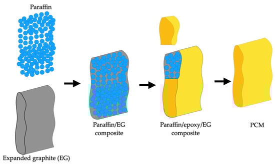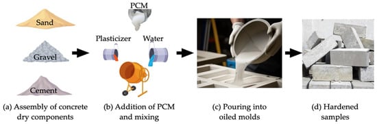 In the direct incorporation technique, PCMs, whether in powder or liquid form, are blended directly into construction materials such as gypsum mortar, cement mortar, or concrete mixes. This approach is considered both straightforward and cost-effective, as it does not demand specialized skills and allows for simple integration into the building matrix [50]. However, a significant drawback is the risk of PCM leakage during its phase transition, particularly during melting. This can lead to material incompatibilities and, in the case of flammable PCMs, elevate fire hazards. Additionally, when PCMs are introduced in liquid form, they tend to reduce the water content of the mixture, which may impair the mechanical strength of the final construction elements, especially under high temperatures [51].