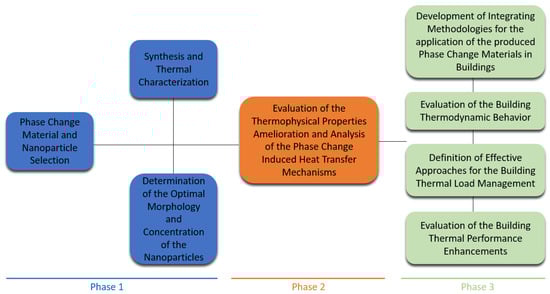 Despite the benefits of PCMs, significant challenges still need to be overcome, such as thermal stability in time, encapsulation capability, compatibility with traditional construction materials, and overall production costs [6]. There is also a growing interest from the research community in designing and implementing certain composite solutions using PCMs. In this sense, recent studies have explored the incorporation of nanoparticles or other particulates to enhance the thermal conductivity of PCMs [7,8,9]. Furthermore, with advances in numerical modeling and experimental techniques, the potential to improve the understanding of the thermal behavior of these materials in residential buildings is very promising [10,11].